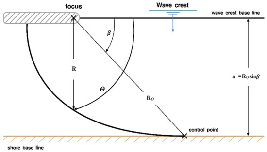 Here, refers to the radical distance from the parabolic focus to the shoreline, refers to the offshore distance between the wave crest baseline that passes the focus and the shore baseline that passes the control point in parallel, refers to the angle between the wave crest baseline and a line that travels from the focus through the control point, refers to the angle between the wave crest baseline and a line that connects the focus with the equilibrium shoreline, and , and are fitting coefficients, as provided by Hsu and Evans [18], as displayed in Figure 2. The sum of the three fitting coefficients must equal 1, so that the bay sector and the linear sector may connect.