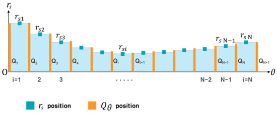 Here, refers to the distance from the center of the circumference to the shoreline. The signs of which must be noted as it decreases if the shoreline advances, and increases if it retreats. Furthermore, can be calculated by using the PBSE-applied longshore sediment transport equation, as shown in Equation (10). Through this process, the effect of wave diffraction is reflected. refers to the longshore directional coordinate, and refers to longshore sediment transport in the direction of . Figure 4 illustrates the application of the polar coordinate system that fits the shape of the shoreline circumference.