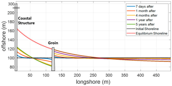 As discussed earlier, the explicit method uses past values to obtain the newly determined location of a shoreline. may be arbitrarily configured, where the longer it is configured, the shorter the calculation time becomes. However, choosing too large a value could compromise numerical and physical accuracy. Hence, a value between 6 and 24 h is widely used. Figure 6 displays the temporal change in which the shoreline changes following the installation of a seaport and offshore structures converge to the equilibrium shoreline (red dotted line), as per Hsu and Evans [18]. The equilibrium shoreline is a result of setting the ends (0, 300) of the structure as foci and applying the PBSE. The total sediment is conserved by blocking the longshore sediment transport rate, , in two end grids ().