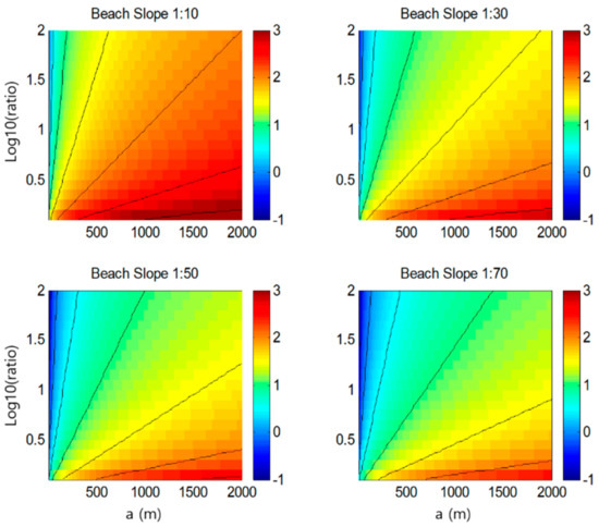 Here, the average beach slope, , obtains a value that is larger than 1 but smaller than 100. Except for the function of , whose influence from the result of Equation (21) is relatively small, the order of the correction factor, , was determined by the offshore distance, , and incident wave height. . Figure 8 illustrates the respective values of the correction factor,, against and according to the average beach slope. Increasing the offshore distance, , shows that the GENESIS model becomes the more underestimated results in shoreline deformation when compared with those of the present study.