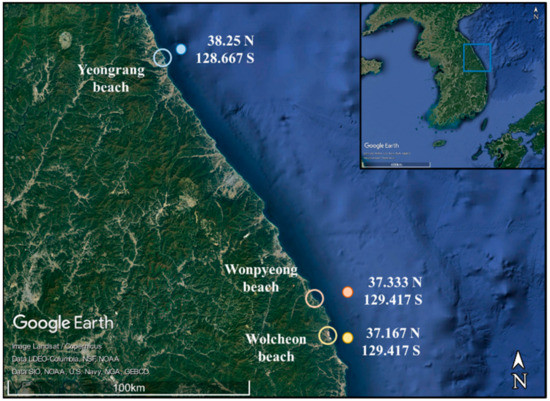 In this chapter, the proposed model was applied to the following three beaches on the east coast of Korea: Wonpyeong, Yeongrang, and Wolcheon beaches. These three studied sites underwent significant erosion damage after the construction of large-scale structures. The wave characteristics of the studied sites were analyzed using wave hindcast dataset provided by the wave information network of Korea [48]. Figure 9 shows a location map of the studied sites for model application, and of corresponding regions for wave hindcast dataset.