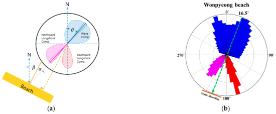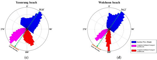 The root mean square (rms) wave heights of Wonpyeong, Yeongrang, and Wolcheon beaches were obtained to be 1.15, 1.04, and 1.00, respectively. Figure 10 shows the rose diagram of wave component (blue color) and corresponding longshore sediment transport components (purple color: northward, red color: southward) obtained from the wave hindcast data. Here, the angle of longshore sediment transport component, , is what (180 is added to wave angle, , as depicted in Figure 10a. The static equilibrium was achieved in the shore angle where the longshore sediment transport rate was in balance. The incident wave angles, , corresponding to the static equilibrium are shown in Figure 10; for Wonpyeong beach, for Yeongrang beach, and for Wolcheon beach. Therefore, if the wave angle, , is larger than the aforementioned values for , longshore sediment transport proceeds northward alongshore. However, if the value is smaller, it proceeds in the opposite direction.