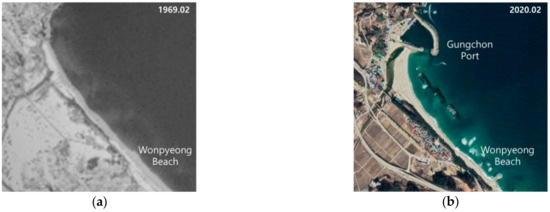 Changes at Wonpyeong beach before and after construction of Gungchon Port: (a) February 1969 (image from NGII(National Geographic Information Institute)); (b) February 2020 (image from Google Earth).
