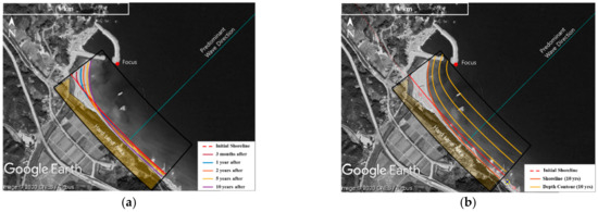 Shoreline change model simulation of change to Yeongrang beach, caused by construction of double headland: (a) shoreline change; (b) depth contour change (image from Google Earth as at April 2019).