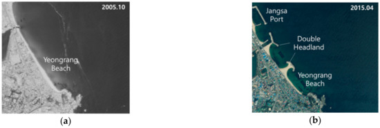 Yeongrang beach before and after construction of double headland: (a) October 2005 (image from NGII); (b) April 2015 (image from NGII).