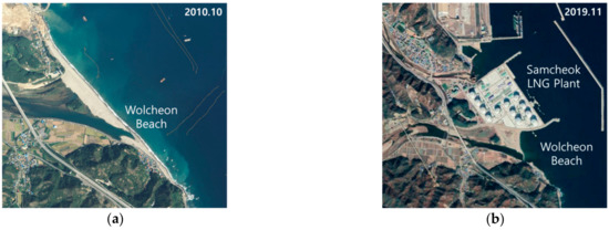Wolcheon beach before and after construction of Samcheok LNG Plant: (a) October 2010 (image from NGII); (b) November 2019 (image from Google Earth).
