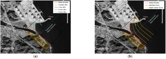 Shoreline change model simulation of change that construction of Samcheok LNG Plant caused to Wolcheon beach: (a) shoreline change; (b) depth contour change (image from Google Earth as at November 2019).