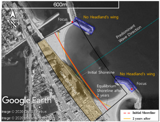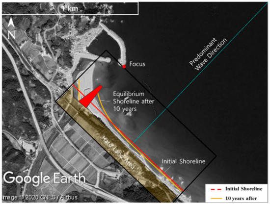 While there may be various reasons, a major cause of erosion is the change to wavefields as a result of the installation of offshore and seaport structures, which causes shoreline changes. Much research has been conducted on the model of shoreline change caused by changes in the coastal environment. However, such models were ineffective because of the uncertainty involved in how a shoreline converges to an equilibrium shoreline. Various studies have been performed on the equilibrium shoreline, but virtually none of the shoreline change models have been applied to target shorelines that should converge to them. Of all the empirical formulas for the equilibrium shoreline, the PBSE suggested by Hsu and Evans [18] is the one that has been most widely used, since its practicality and accuracy was confirmed. Hence, it was adopted in this study as well.