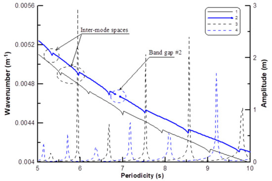 - The second type of discontinuity observed in the dispersion spectra consists of ranges of the frequency where no modes occur at all; these ranges are known as “band gaps” (Freed-Brown et al., 2012). They are observed only for the crevasse-ridden ice tongue. In particular, for period range 5–250 s considered in this study, there are two “band gaps” for the crevasse-ridden ice tongue. The modes of the ice-tongue vibrations change rapidly inside the “band gaps”, and these changes cause the “band gaps”. The widths of the “band gaps” depend on the depth of crevasses’ penetration into the ice. Essentially, the widths increase with crevasse-depth () growth, and they attain a maximum at in the model (Figure 4).