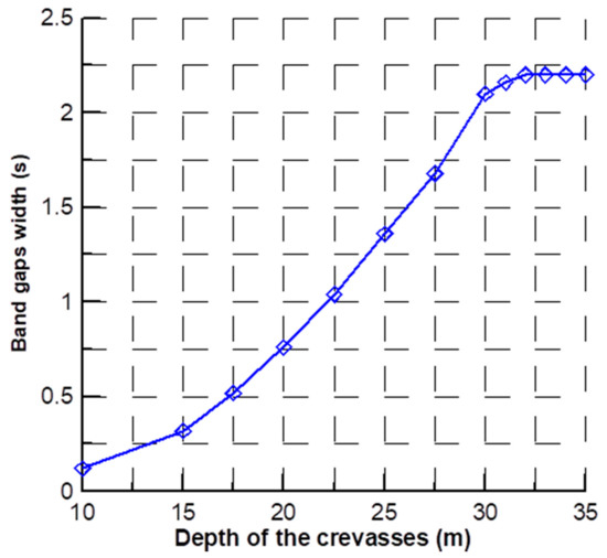- The modeling reveals that the increasing band-gap width causes a decrease in the spectral average amplitude of the vibrations in the vicinity of the “band gaps”. Moreover, band-gap width attains a maximum (Figure 4). Thus, achievement of a maximum in the band-gap width provides the achievement of the minimum of the spectral average amplitude of the vibrations in the vicinity of the “band gaps”. These results correlate with the results derived from the exact solution (6). The exact solution (6) reveals that the average amplitude of the gravity waves in channel with the crevasse-ridden bottom drops and attains a minimum (Figure 7).