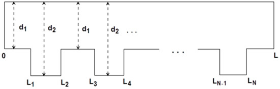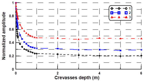 - The exact solutions obtained for the shallow water channel with the crevasse-ridden bottom (Figure 6) likewise reveal that the average amplitude drops as the crevasse-depth increases. Moreover, the average amplitude attains a minimum at and then the amplitude becomes unchanged by further changes in crevasse depth (Figure 7). The minimum level of the average amplitude depends on the periodicity of the crevasses. As the density of crevasses increases (the decrease in the crevasses’ periodicity ), the minimum level of average amplitude decreases (Figure 7).