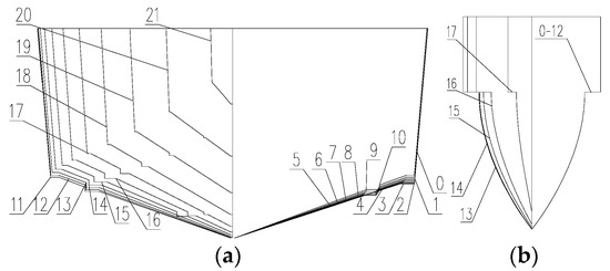Molded lines of the model: (a) main hull; (b) side-hull.