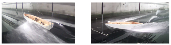 In the model tests, aimed at the two displacements and three longitudinal positions of the CG, four conditions were designed, as shown in Table 2. The towed speeds of the model were 3–13 m/s (length Froude numbers Fr = 0.63–2.72) or until porpoising occurred. The wave surface condition around the model and the stern wake in the distance were clearly captured, as presented in Figure 4, which shows the photographs from various perspectives of the model at Fr = 1.26 under condition two, and subsequently, a Longitudinal location of CG/Main hull length (Lcg/Lm) ratio of 0.38 occurred under condition two.