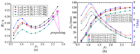 For the model with equal displacement during the semi-planing state, as the Lcg moved backward, the resistance peak increased. When Fr > 1.05, as speed further increased, the more the Lcg moves backward within a certain scale, the more the RT decreased, but the Zcg and τ increased. In addition, when the Lcg remained at the same and speed increased, the RT, Zcg, and τ of the small-displacement boat were all less than those of the large-displacement boat, especially for the small-displacement boat, RT is lesser when crossing the resistance peak.