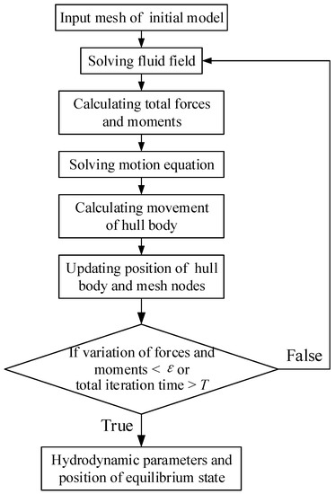 The overset-grid method, as described in Ref. [36], was adopted due to the complex hull motion. The solver procedure of the numerical method is shown in Figure 6. When variations of the forces and moments were less than the tolerance (ε) or the total iteration time (T) reaches, the calculation was terminated.