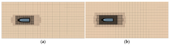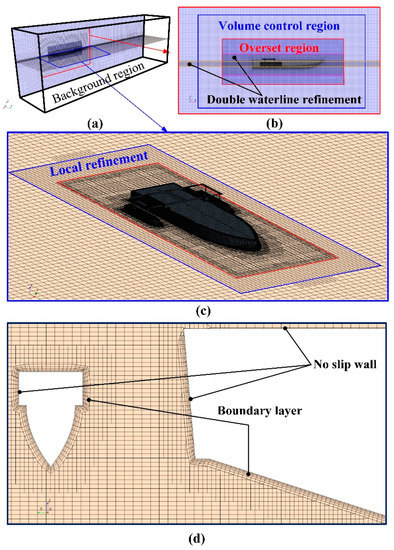 The grids in the background and overset region were automatically generated, as shown in Figure 8, and the grids of the two regions defined as follows: The cutting hexahedron grids were mainly used to discretize the background region, both the cutting hexahedron grids and the prismatic layer grids were selected to fill the overset region due to the complex geometrical details of the hull body. To obtain the more accurate flow field around the hull, the circumambience of the hull was refined by the smaller hexahedron grids in the volume control region; for the grids around the free surfaces in the two regions, that were set to more than twenty layers in the vertical direction to clearly capture the change of free surface; and the boundary layer grids were imposed on the surface of hull body.
