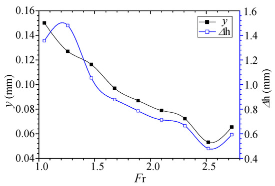 In this research, five boundary layers were adopted with a grid growth rate of 1.3. The generated boundary layer grids on the hull body are presented in Figure 8d. The details of when the y+ = 250, the y values, and total boundary layer grid reached thicknesses ∆h at different speeds are shown in Figure 9.