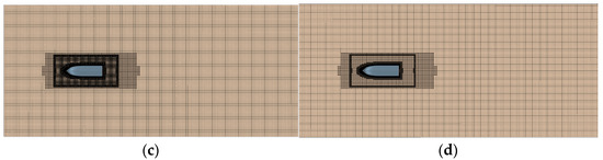 To verify the convergence of the grid, four grids were designed, whose sizes on the hull surface and in the background region were the same, but the grid sizes in the overset region, volume control region, and around the free surface increased with the refinement ratio (, Lg = 1 m), the grid parameters of four grids are shown in Table 3, and the grids around the hull and the free surface are presented in Figure 10. Then, the sailing of the model in calm water was simulated, and the results of resistance were compared with the test. The numerical setting is consistent with the Section 3, and the towing speed Fr = 1.26 (v = 6 m/s) was selected for verification.