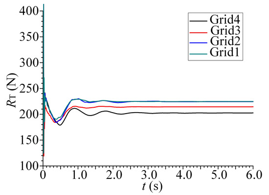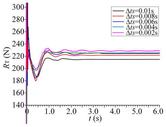 Table 6 and Figure 14 shows that the five resistance curves had the same convergence trend, the larger ∆ts (0.01 s) had a weaker calculation accuracy, and the deviation became smaller with the shortening of the time step, which indicates a smaller time interval is conducive to improve the solution precision. However, when the ∆ts was less than 0.004 s, further reducing the ∆ts value greatly increased the convergence duration, which caused a waste of calculation efficiency, so the time step ∆ts = 0.004 s was adopted because of its higher accuracy and lesser calculation duration.