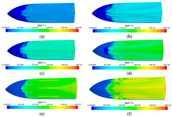 In general, the value of y+ has a profound influence on the calculation accuracy. In 2005, Wang et al. [39] analyzed the influence of y+ on the turbulence problem, indicating that the y+ value near the hull should be restrained between 30 and 300. Thus, to ascertain the influence of y+ value on the calculation accuracy, six different y+ values of 50, 100, 150, 200, 250, and 300 were selected, and as in the previous CFD set up, simulations of different y+ values were conducted, and the wall y+ and resistance after calculation were obtained, which are shown in Figure 12 and Table 5, respectively.