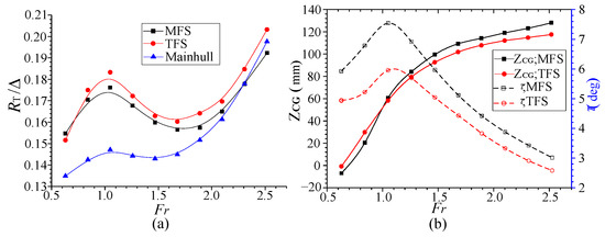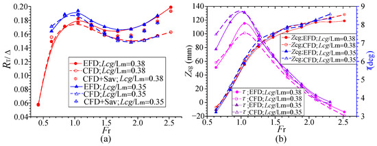 Combing test phenomena and results, we found that at low speeds (Fr < 1.05), the bow was gradually lifted upwards as the speed increased. At the semi-planing state (Fr = 1.05), the sinkage and trim angle increased significantly. When crossing the resistance peak, entering the planing regime (Fr > 1.05), the RT appeared to be notably reduced; however, after descending to a certain threshold, the RT rose and exceeded the previous peak as the speed further increased. When Fr > 2.31, the Zcg increased slowly, but the τ always reduced as the speed increased during the planing stage.