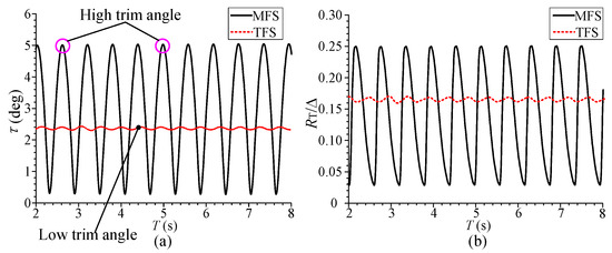 The oscillation comparisons of τ and Zcg are shown in Figure 33, further processing the results, the dimensionless oscillation amplitudes of trim angle and sinkage (CZ = |Zcg − Zav|/Zav) were attained, and based on the acquired τav, τ (maximum), and the whisker spray equation of Savitsky [27], the total resistance (Rav) including RS, the maximum resistance (Ram) and the percentage of resistance increment (PRI = (Rav − Rav_m)/Rav_m%) on releasing side-hulls when porpoising were solved and listed in Table 12.