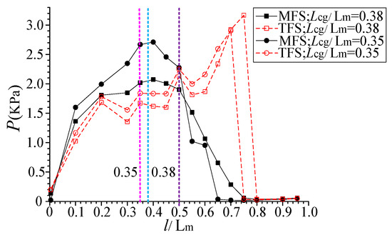 Figure 27 shows the side-hulls adjustment mode of the longitudinal location. The ratio a/Lm was adjusted and the longitudinal location of side-hulls, the Lcg, and the longitudinal inertia tensor (Iyt) of the TFS were changed. Then, six different longitudinal locations of the side-hulls are designed and shown in Figure 28a, corresponding to the NOs. 1–6, as listed in Table 8. Besides, for condition two, the Lcg and Iyt of the TFS after adjustment was measured by utilizing the Creo software, presented in Table 8.