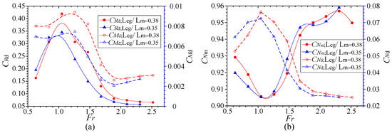 Influence of the longitudinal and vertical side-hull locations on (a) Cτ, (b) CRa, (c) CRd, (d) Rd/RT, (e) CMd, and (f) CNd.