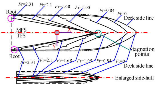 The hard chine test model (main hull), built-in wood, was square-tailed and non-stepped, had a larger knuckle line width, a plurality of spray deflectors with variant dimensions were symmetrically installed at the main hull bottom to improve its seakeeping and reduce resistance in calm water. The twin side-hulls were arranged at both broadsides of the main hull by a link bridge, were thin and sharp in cross-section, slender in whole and vertical in the bilge, provide bare buoyancy and hydrodynamic lift but improved directional stability. The molded lines of the main hull and side-hulls are presented in Figure 2. For convenient adjustment to the center of gravity (CG) position in the TFS and making the model easier to slide, the twin side-hulls were initially designed on both sides of the rear of the main hull as shown in Figure 1b, and the specific location is listed in Table 1.