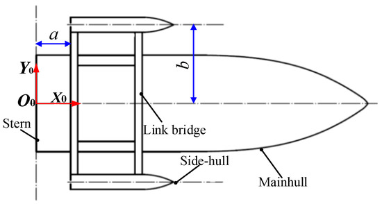 This study took a 1:2.5-scale test model of an actual planing hull with twin position-adjustable side-hulls as a research object. The twin side-hulls can be synchronously placed in any longitudinal, horizontal, and vertical positions of the ship broadsides within a certain scale range by the variable-structure link bridge. When on a relatively stable seas, the craft will pack up the twin side-hulls and sail forward quickly in the monomer-form state (MFS), as shown in Figure 1a. When encountering high sea conditions, it will put down the twin side-hulls and sail stably in the TFS, as shown in Figure 1b. Main geometric details of the planing hull in different navigation states are listed in Table 1.