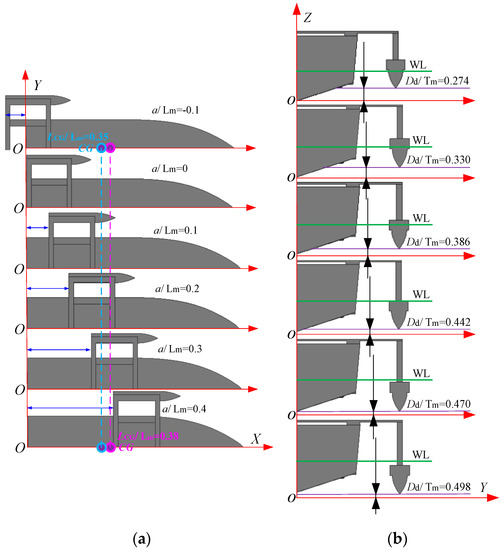 Different (a) longitudinal locations; (b) vertical locations of the side-hulls in the TFS.