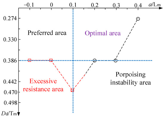 Side-hull longitudinal locations exceeding the ratio of a/Lm = 0.3 are not recommended, and vertically, the draft ratio (Dd/Tm) is suggested not to exceed 0.442. The positive range of side-hull locations is and , and in the optimal area, porpoising could be suppressed; the boat can also then sail with lesser resistance. In addition, at the scale of a real ship, longitudinally, the side-hull locations are recommended not to be less than the ratio a/Lm = 0.1 to avoid increasing resistance.