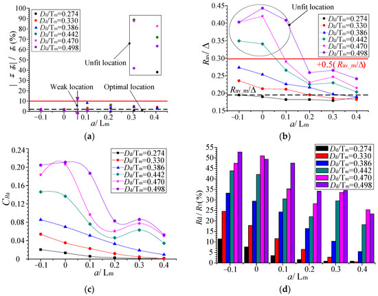 Figure 32a shows that side-hulls being placed relatively forward (a/Lm = 0.4) was not conducive to inhibiting porpoising. For the side-hulls, when backward relative to the CG of the main hull, the deeper the draft in the vertical direction, and the greater the total resistance (Figure 32b), then the side-hulls resistance and the ratio of Rd to RT also increased when porpoising.