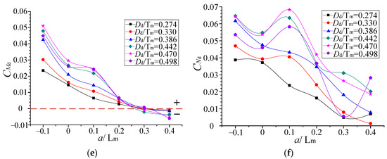 Figure 32e shows that when a/Lm > 0.3, the CMd becomes negative, porpoising occurs at the unfit location (Figure 32a); as the side-hulls move backward, there was an obvious increase in CMd, which further proves the previous analysis.