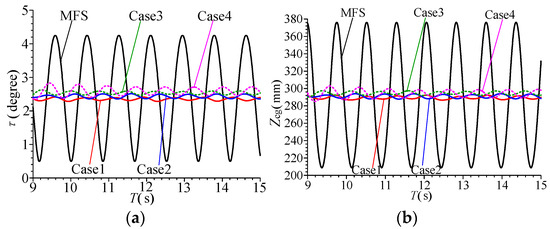 Oscillation comparisons of (a) τ and (b) Zcg when porpoising under condition 2.