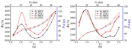 In addition, through the deliberation to Cτ, Rav, and Ram in Table 12, case 2 was chosen as the better side-hulls placement. And utilizing the verified CFD method and the whisker spray equation of Savitsky [27], RT and Pw of the RS in the MFS and TFS (cases 2) at different speeds were computed, the RT and Pw curves with speed increasing under conditions two and three, are shown in Figure 34, which can provide a sufficient reference for the overall design of planing boats with this concept.