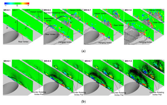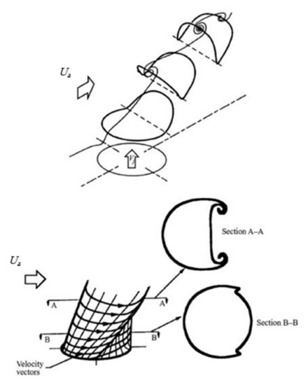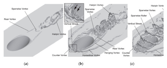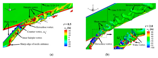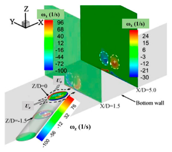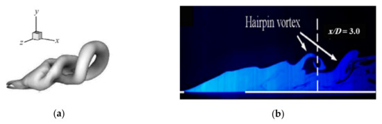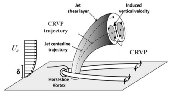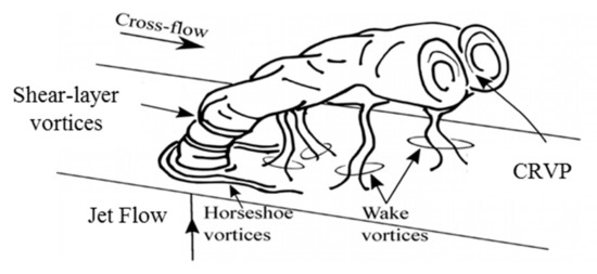 A complex interaction between the jet and the cross-flow results in the formation of complicated vortical structures, which are the paramount physical phenomena appearing in a JICF [27]. As shown in Figure 5 and Figure 6, a counter-rotating vortex pair (CRVP), shear-layer and/or ring-like, hairpin, hanging, horseshoe, and tornado-like wake vortices are the vortical structures introduced in the JICF.