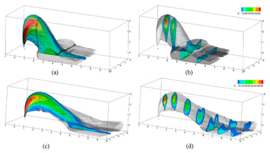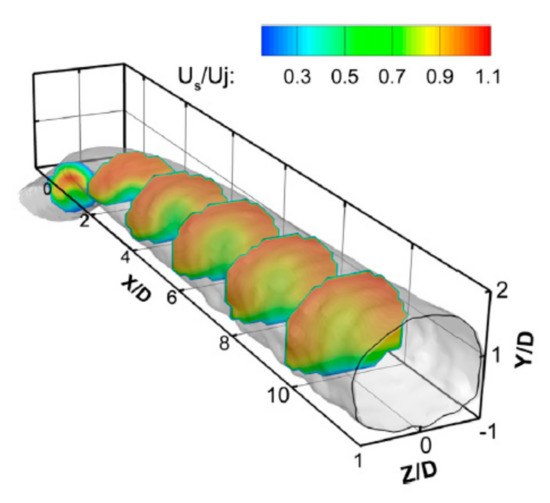 The time-averaged behavior of a JICF (under the conditions Re0 = 5000 and r = 5.7) obtained from a direct numerical simulation (DNS) that resolves all temporal and spatial turbulence scales is also illustrated in Figure 7. As is obvious, the contours of the mean velocity show that the jet gets deflected in the direction of the cross-flow, and then the jet becomes wider toward the leeward side of the center streamline (as it moves downstream) than toward the windward side. Furthermore, the cross-section of the jet develops from its circular shape to generate the CRVP [28]. The local mean vorticity reaches its maximum at the CRVP’s center. Based on the center streamline, therefore, the jet trajectory penetrates deeper into the cross-flow compared with a trajectory based on the vorticity [78].