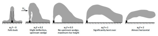 - In the case of (or ), the dynamic impact of the source volumetric flux may be ignored, and accordingly or F does not show individually in the list of dependent parameters. Although works done by Roberts and Toms [23] and Gungor and Roberts [39] recommend that the jet-densimetric Froude number should be greater than about 20 for dense buoyant jets in order to neglect the effect of the source volumetric flux, the question of how large the F value would exactly be still needs further investigation.