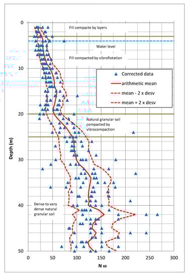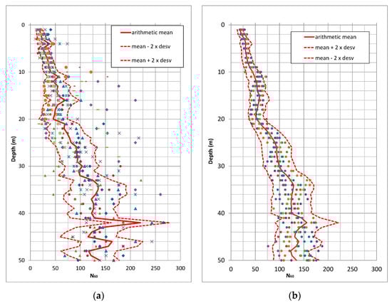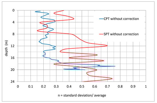 In the same way, the mean and standard deviation have been obtained at each depth for the SPT test, based on the data in Figure 1. So, both dispersions can be compared through the ratio defined as (Equation (3)):