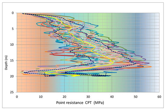 The following Figure 2 shows the point resistance measured in CPT tests. From there, the mean (represented in yellow) and the mean +/− the standard deviation (represented in blue) have been obtained for each depth.