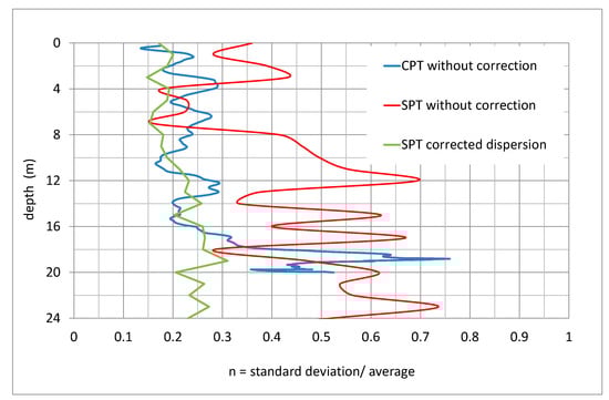 The idea behind is the concept of minimum statistical variance. It is well known that SPT and CPT tests measure different parameters but also that there is a relationship between them [,]. This ratio can be obtained by comparing the results of both sets of tests. However, the issue of interest at the moment is the dispersion presented by both tests. It could be said that the lower dispersion is an upper limit of the dispersion of the random variable that represents the resistance of the soil. Thus, the test with the highest dispersion must be corrected to a dispersion similar to that of lower one; this correction being a way to eliminate uncertainty in the result introduced by the measurement test.
