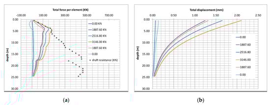 Numerical models outputs for each load step (a) skin friction versus depth (b) displacement distribution versus depth.