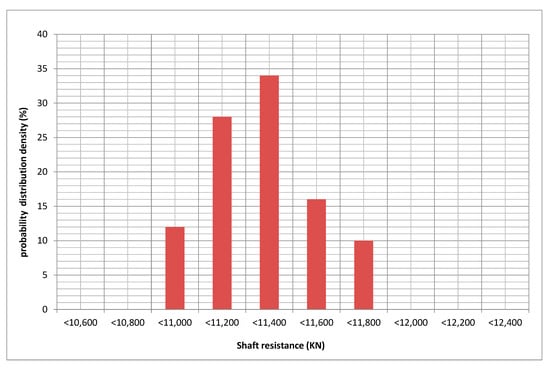 The model requires working out the total bearing capacity in order to define the t-z and base-displacement functions. Since the inputs are statistical functions, the outputs are also given in the same way. The following Figure 16 and Figure 17 show separately the point and shaft resistance of the piles.