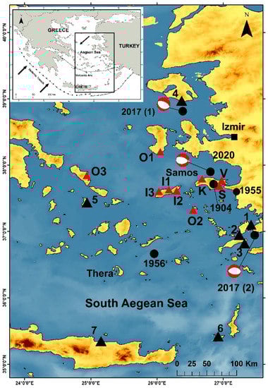 - Papadimitriou, P.; Kapetanidis, V.; Karakonstantis, A.; Spingos, I.; Kassaras, I.; Sakkas, V.; Kouskouna, V.; Karatzetzou, A.; Pavlou, K.; Kaviris, G.; et al. Preliminary Report on the Mw=6.9 Samos Earthquake of 30 October 2020. Available online: https://www.emsc-csem.org/Doc/Additional_Earthquake_Report/915787/Samos2020_preliminary-report_nkua.pdf (accessed on 30 November 2020).