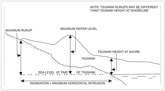 Schematic explanation of some commonly used tsunami terms (adapted from [] as modified from []; similar terms have been adopted in the Intergovernmental Oceanographic Commission IOC Tsunami Glossary 2019, http://itic.ioc-unesco.org/index.php?option=com_content&view=article&id=2078&Itemid=2306; last access November 2020). The term “run-in” may be used instead of inundation. The term “tsunami amplitude” is in use by some authors to describe either tsunami height at sea shore or wave amplitude in the open sea. The term “flow depth” is also used instead of “run-up” for the tsunami height above the ground, at a specific location, as indicated by water markers.