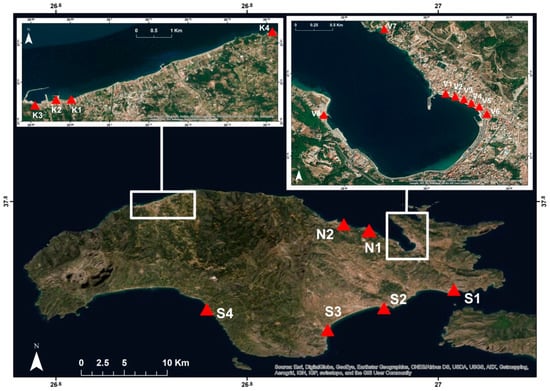 In Karlovasi town, the urban planning features are similar to those in Vathy. Three observation sites (K1–K3, Figure 3) of main interest are situated in the area of the port and of the nearby marina. The ground level of the coastal pedestrian zone in front of the Port Authority building was measured at ~1.1 m asl. Another site of great interest is the Ayios Nikolaos beach (K4) situated ~5.8 km east of Karlovasi. In between Ayios Nikolaos and Vathy town, two sites were examined in Kedros (N1) and Kokkari (N2) (Figure 3). In the south coast, the four sites examined are shown in Figure 3.