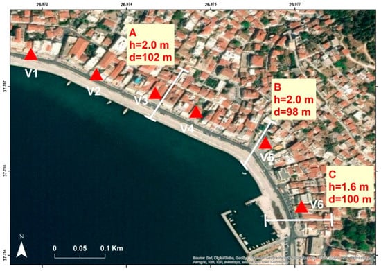 Observation sites V1 to V6 (red triangles) along the Vathy bay east coast and three characteristic tsunami transects A, B, C (white lines), measuring maximum run-up, h, at respective run-in distance, d (for details, see in text).
