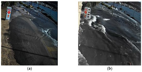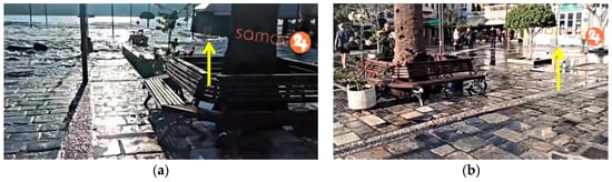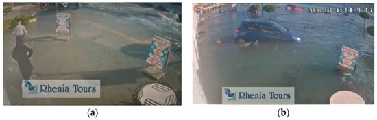 V4. Library (D~35 m, 37.756457, 26.975358). A valuable video record of both inundations has been obtained from an external security camera. The video timer was absolutely accurate, as one may conclude from the record of the earth shaking at 11:51:34. The video time in site V4 has been used as reference for the correction of time in the site V1 videos. The first tsunami inundation on the seawards pedestrian zone, i.e., at a height of 0.6 m asl, was recorded at 12:04:15. People are seen running to escape (Figure 8a). The inundation covered the entire zone of 35 m (Figure 8b) and flowed upstream in a nearby small street. Water retreat started at ~12:06.