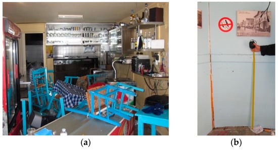 Site V2. Indoor material damage caused by the tsunami attack in the fish restaurant (a). Water mark at h~1.09 m was measured at a run-in distance of 45 m (b) (photo credit, I. Triantafyllou).